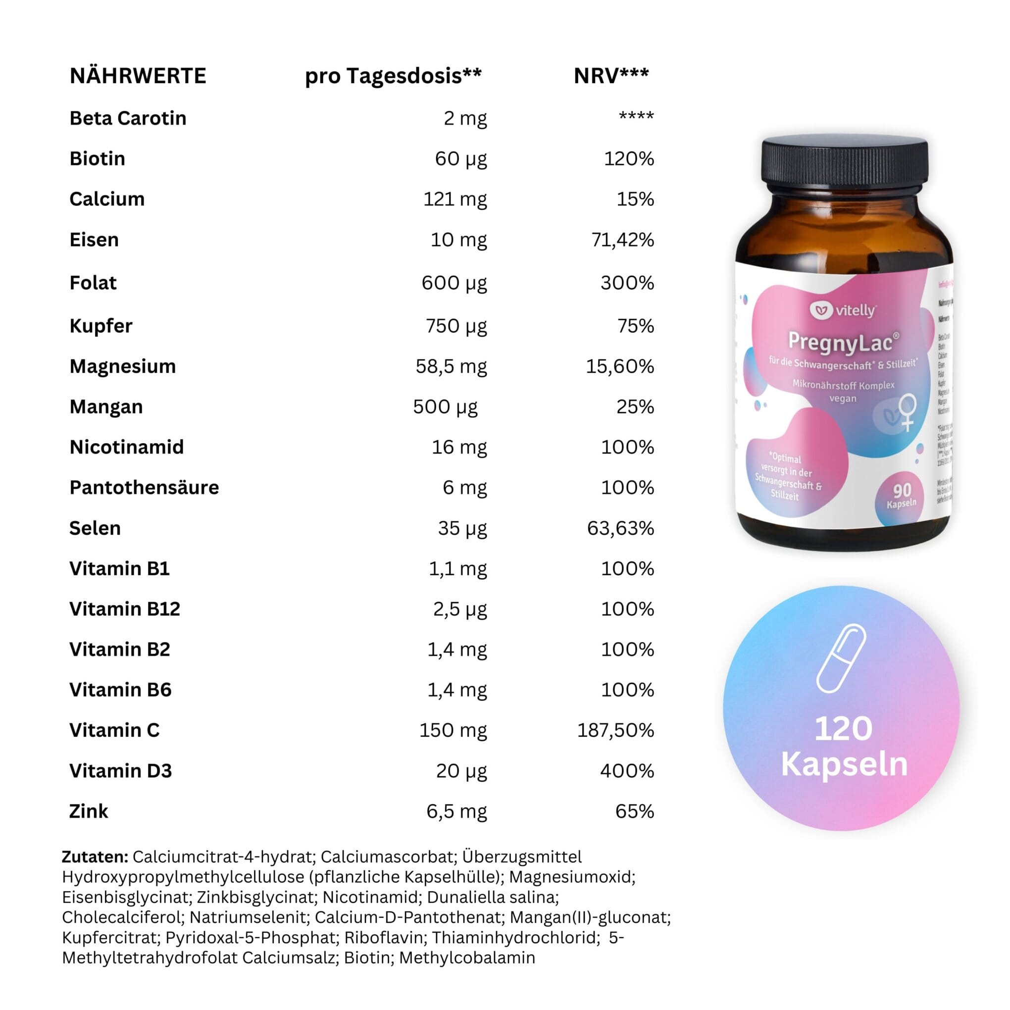 Calciumcitrat-4-hydrat; Calciumascorbat; Überzugsmittel Hydroxypropylmethylcellulose (pflanzliche Kapselhülle); Magnesiumoxid; Eisenbisglycinat; Zinkbisglycinat; Nicotinamid; Dunaliella salina; Cholecalciferol; Natriumselenit; Calcium-D-Pantothenat; Mangan(II)-gluconat; Kupfercitrat; Pyridoxal-5-Phosphat; Riboflavin; Thiaminhydrochlorid; 5-Methyltetrahydrofolat Calciumsalz; Biotin; Methylcobalamin
